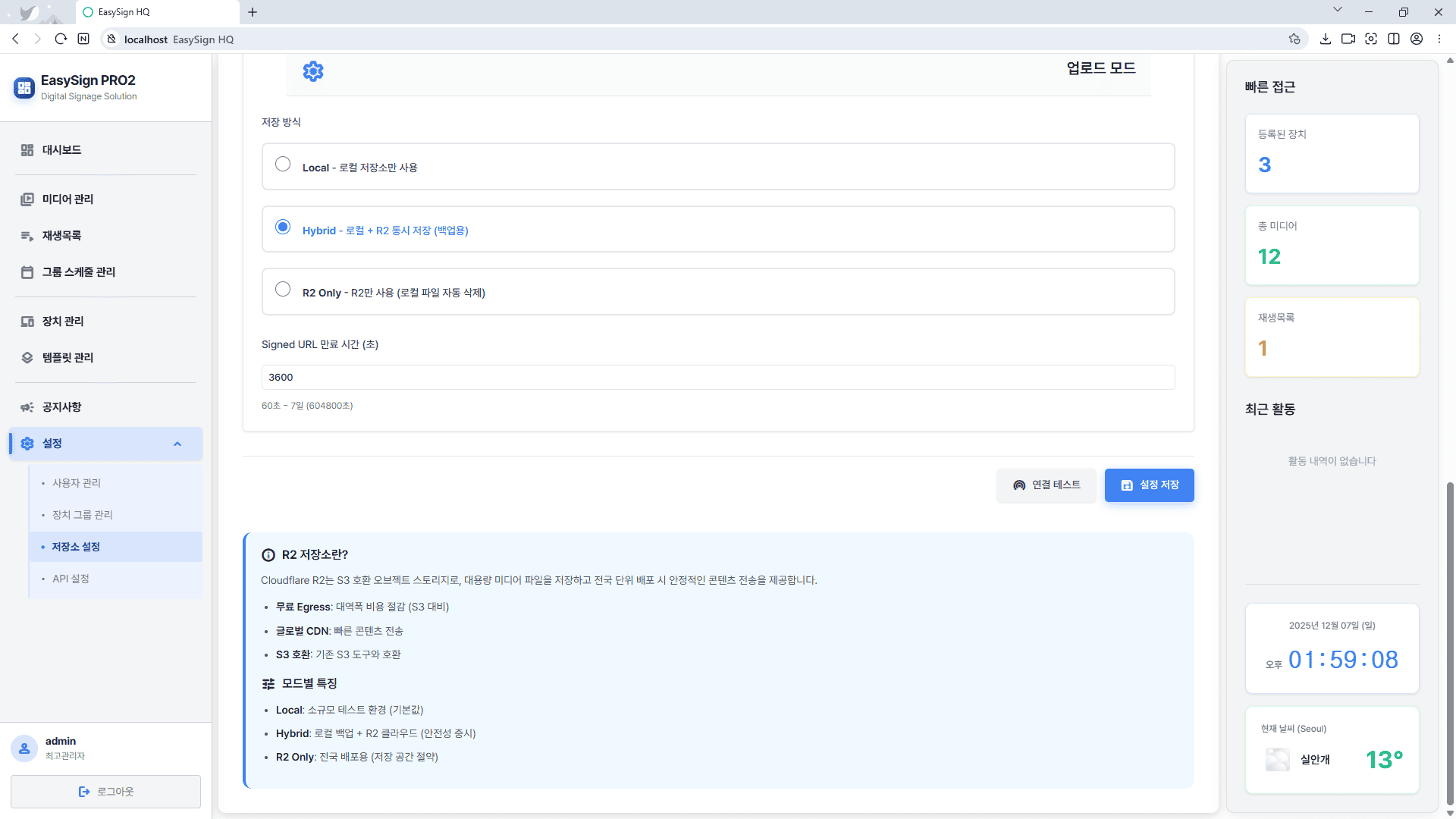 EasySign HV PRO2 솔루션은 Cloudflare R2는 S3 호환 오브젝트 스토리지를 이용하여, 대용량 미디어 파일을 저장하고 전국 단위 배포 시 안정적인 콘텐츠 전송이 가능한 클라우스 솔루션을 제공합니다.