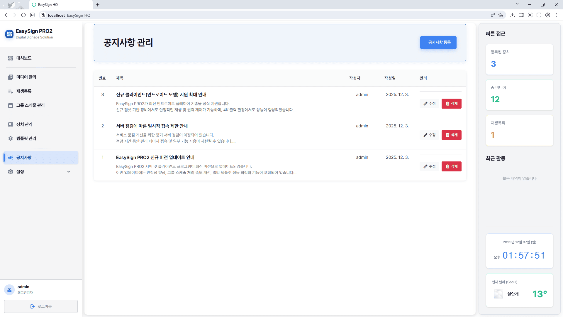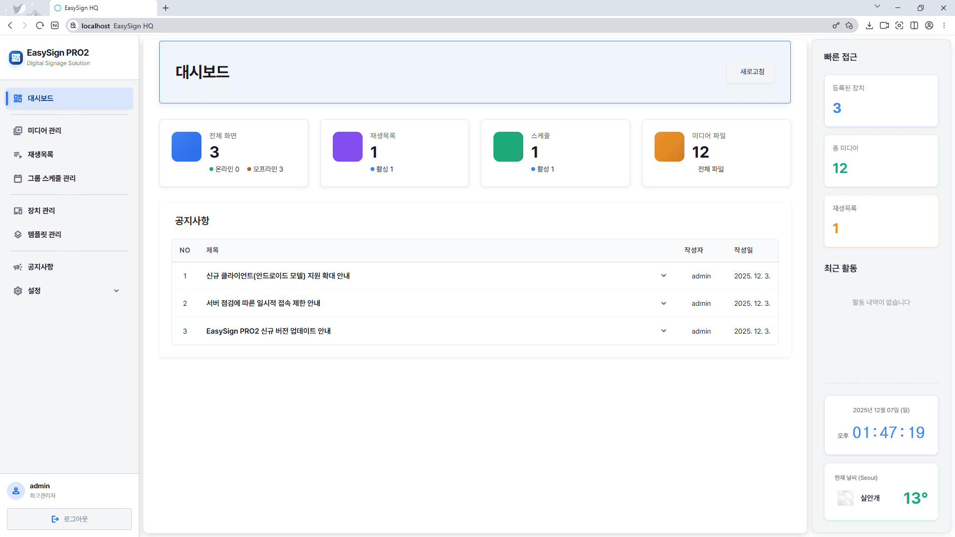 EasySign HV PRO2 대시보드는 전체 스크린 수, 온라인/오프라인 장치 상태, 활성 재생목록 및 스케줄 현황 등 핵심 정보를 한눈에 보여주며, 미디어 관리·재생목록 편집·스케줄 배정·장치 제어 등 주요 기능을 즉시 실행할 수 있는 직관적 메뉴와 실시간 상태 모니터링 카드를 제공해 시스템 운영 상황을 빠르게 파악하고 대응할 수 있으며, 최근 연결된 장치 목록과 중요 공지사항을 대시보드에서 바로 확인할 수 있는 알림 기능, 그리고 각 항목별 통계를 시각적으로 표시하는 세련된 UI로 누구나 안정적이고 효율적으로 디지털 사이니지 환경을 운영할 수 있도록 돕는 통합 관리 화면입니다.