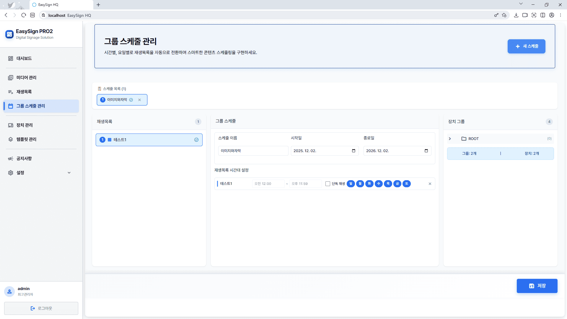 EasySign HV PRO2 그룹 스케줄 관리는 주간 또는 월간 달력 형태의 그리드 편집기로 00:00부터 23:30까지 30분 단위 타임슬롯에 재생목록을 직관적으로 배정할 수 있으며, 시간 범위를 드래그하여 스케줄을 빠르게 생성하고 특정 요일 반복 설정이나 특정 날짜 지정을 자유롭게 선택할 수 있는 유연한 일정 관리 기능을 제공하며, 같은 시간대에 여러 재생목록이 배정되었을 때 우선순위로 재생 순서를 제어하고 특정 장치 그룹에 스케줄을 일괄 배정하여 여러 장치를 동시에 관리할 수 있으며, 스케줄 변경 시 연결된 모든 디지털 사이니지 장치에 실시간으로 자동 반영되어 즉각적인 콘텐츠 업데이트가 가능하도록 돕는 시간대별 콘텐츠 스케줄링 시스템입니다.