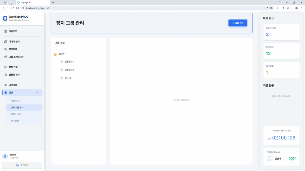 EasySign HV PRO2 장치 그룹 관리는 여러 디지털 사이니지 장치를 논리적 그룹으로 묶어 체계적으로 분류하고 같은 그룹에 속한 모든 장치에 동일한 스케줄을 일괄 적용하여 반복 작업을 줄일 수 있으며, 그룹 생성·이름 변경·삭제와 그룹별 장치 할당을 자유롭게 관리할 수 있는 편집 기능을 제공하며, 매장별·층별·용도별 등 다양한 기준으로 장치를 그룹화하여 대규모 디지털 사이니지 네트워크도 효율적으로 운영할 수 있고, 그룹 단위로 스케줄을 배정하면 해당 그룹의 모든 장치에 자동으로 동기화되어 수십 대의 스크린도 한 번에 제어할 수 있도록 돕는 장치 그룹 통합 관리 시스템입니다.