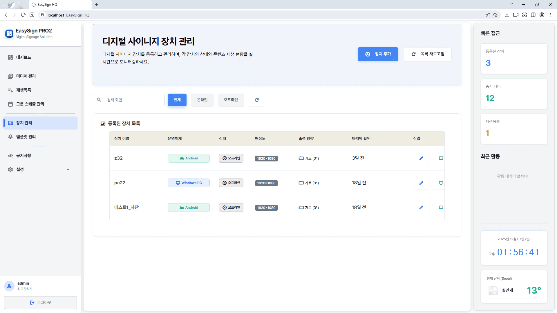 EasySign HV PRO2 장치 관리는 새로운 디지털 사이니지 스크린을 추가하고 고유 Device ID로 기기를 식별하여 페어링할 수 있으며, 각 장치의 온라인/오프라인 상태를 실시간으로 모니터링하고 마지막 접속 시간을 추적하여 장치 연결 상태를 즉시 파악할 수 있는 모니터링 기능을 제공하며, 장치 설치 위치(Location) 정보와 멀티 모니터 환경에서의 모니터 번호를 관리하고 각 장치별로 개별 스케줄을 할당하거나 장치 그룹 단위로 일괄 제어할 수 있어 대규모 디지털 사이니지 네트워크도 효율적으로 운영할 수 있으며, 원격에서 장치 상태를 확인하고 제어할 수 있도록 돕는 디바이스 통합 관리 시스템입니다.