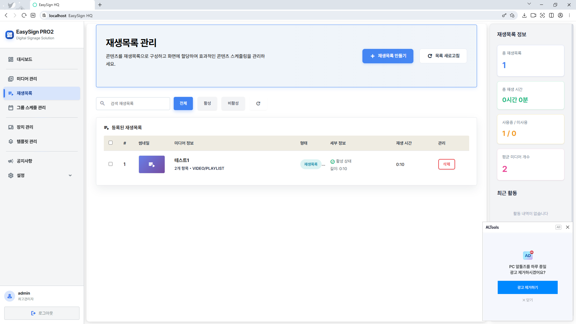 EasySign HV PRO2 재생목록은 미디어 라이브러리에서 선택한 이미지와 동영상을 드래그 앤 드롭으로 자유롭게 배치하고 재생 순서를 직관적으로 편집할 수 있으며, 각 미디어별로 개별 재생 시간을 초 단위로 세밀하게 설정하고 전체 재생목록의 총 재생 시간을 실시간으로 확인할 수 있는 편집 기능을 제공하며, 여러 재생목록 간 우선순위를 지정해 같은 시간대에 복수의 콘텐츠가 배정되었을 때 어떤 것을 먼저 재생할지 제어할 수 있고, 한 번 만든 재생목록을 여러 스케줄에서 재활용할 수 있어 반복 작업을 줄이고 효율적으로 콘텐츠 재생 흐름을 구성할 수 있도록 돕는 재생 순서 편집 도구입니다.
