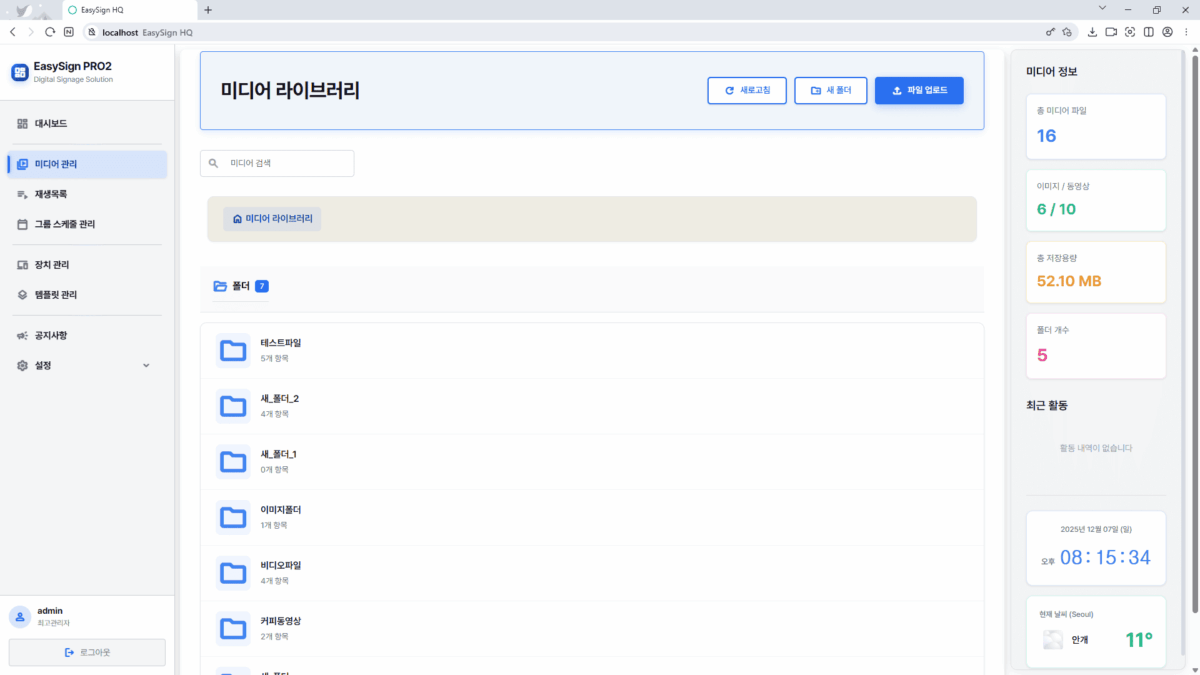 EasySign HV PRO2 미디어 관리는 이미지와 동영상 파일을 드래그 앤 드롭으로 간편하게 업로드하고 폴더 구조로 체계적으로 분류할 수 있으며, 각 파일의 썸네일 미리보기를 통해 콘텐츠를 한눈에 파악하고 원하는 미디어를 빠르게 찾을 수 있는 검색 및 필터링 기능을 제공하며, 폴더 생성·이름 변경·삭제와 미디어 파일 이동을 자유롭게 할 수 있는 계층적 관리 시스템과 파일명·크기·업로드 날짜·경로 등 상세 정보를 제공해 대용량 콘텐츠 라이브러리도 효율적으로 관리할 수 있으며, 철정한 디자인 규칙을 준수한 일관된 UI로 누구나 쉽고 직관적으로 디지털 사이니지 콘텐츠를 중앙에서 통합 관리할 수 있도록 돕는 미디어 저장소입니다.