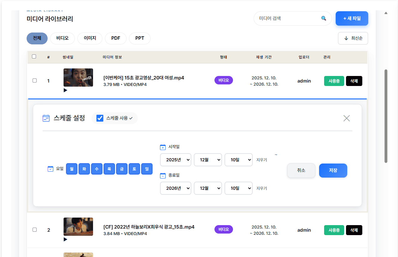 파일 이름·타입·크기·업로드 날짜 기준 검색·필터링 기능을 제공해 원하는 미디어를 빠르게 찾을 수 있으며, 이름 변경·순서 조정·일괄 삭제·재생시간 설정 등이 가능한 직관적 편집 도구를 지원합니다.