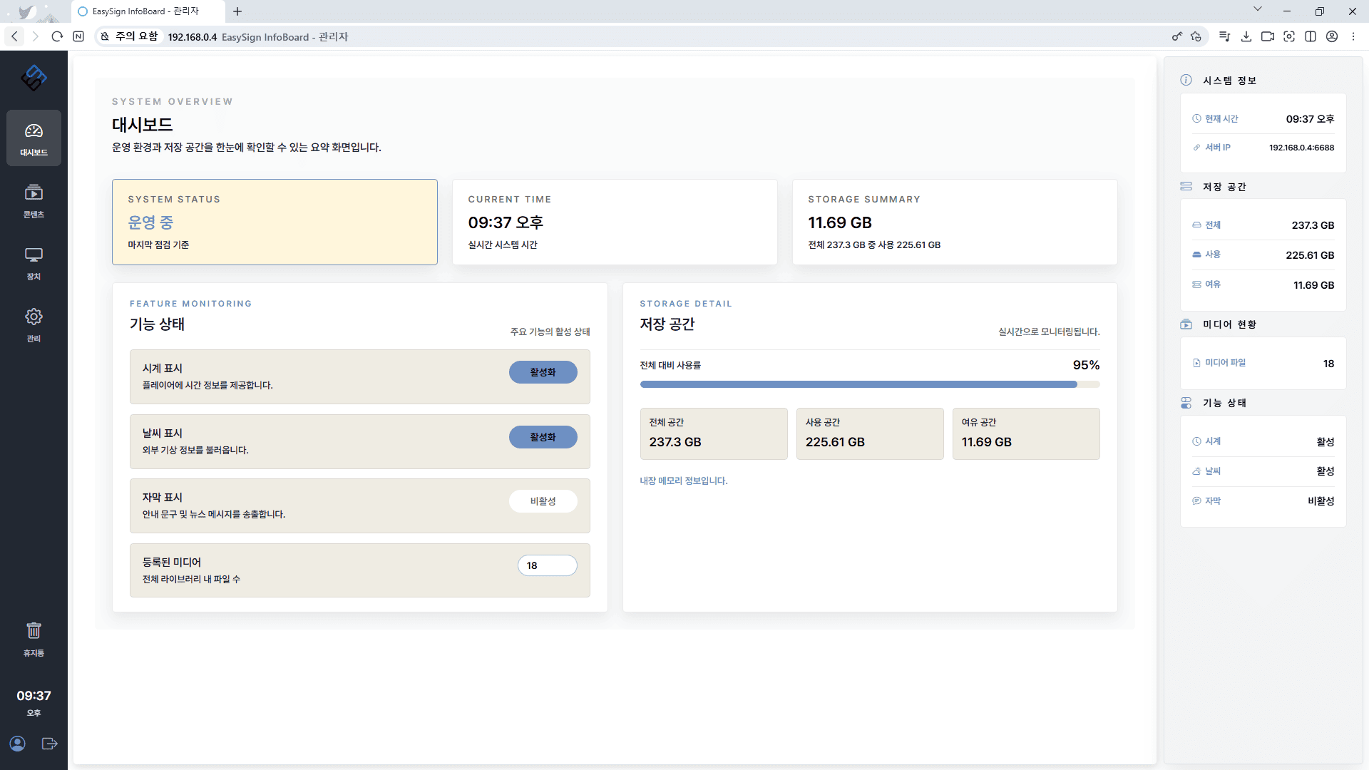 EasySign InfoBoard 대시보드는 등록된 장치 수, 온라인/오프라인 상태, 활성 미디어, 예약 현황 등 핵심 정보를 실시간으로 보여주는 통합 관리 화면입니다.
