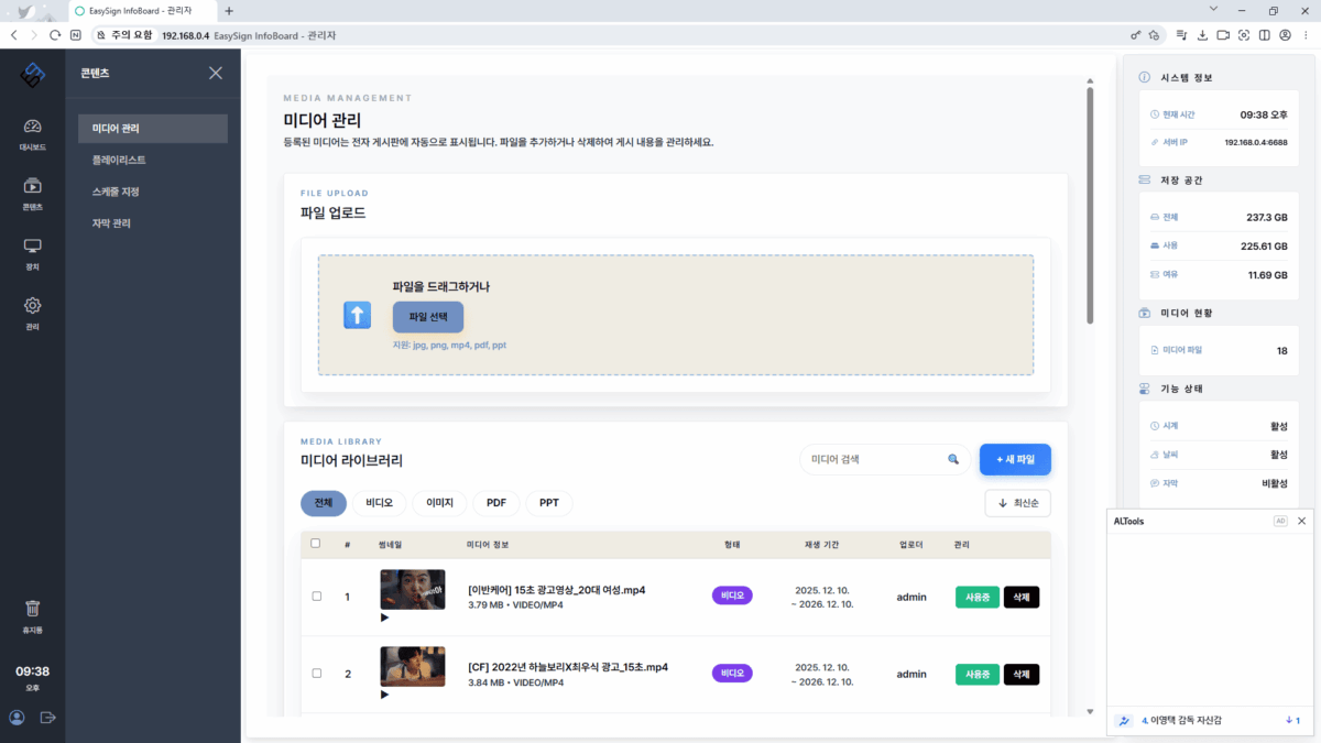 EasySign InfoBoard 미디어 관리는 이미지·동영상·PDF·PPT·URL 등 다양한 콘텐츠를 드래그 앤 드롭으로 쉽게 업로드하고, 자동 생성되는 썸네일로 콘텐츠를 한눈에 확인할 수 있습니다.