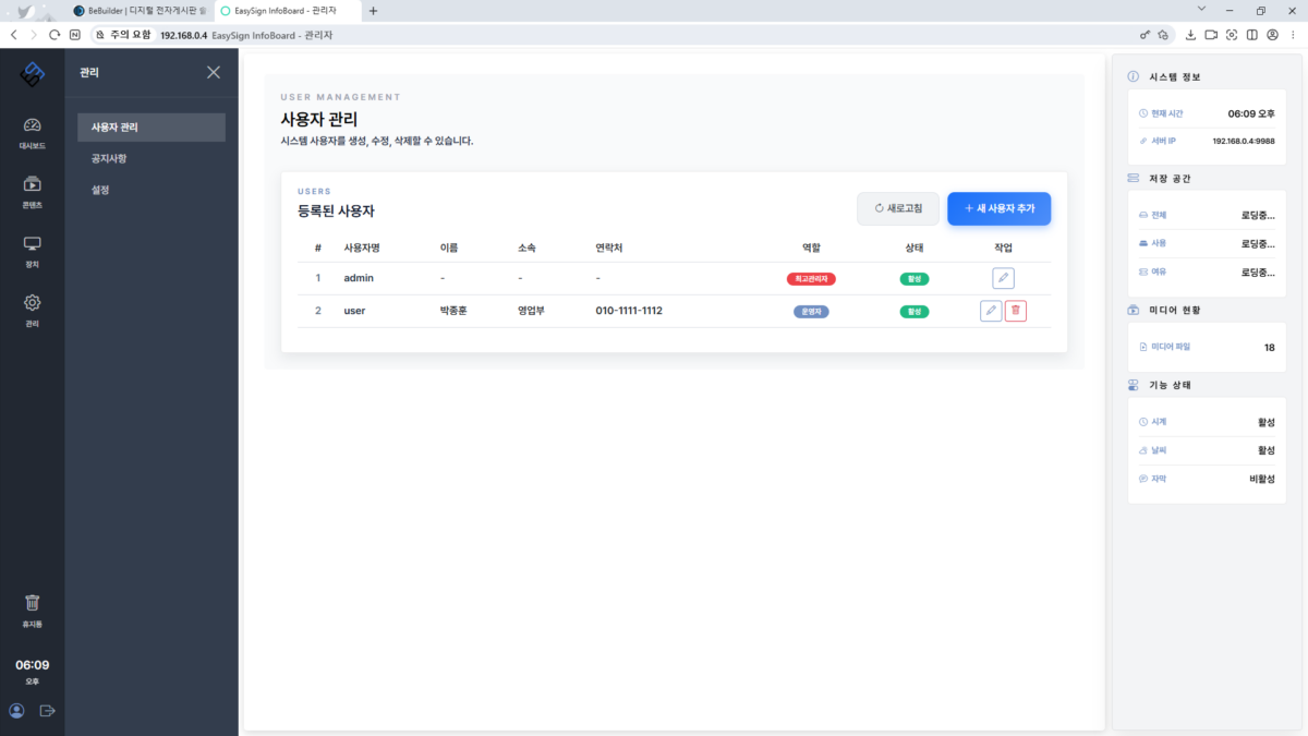 사용자 관리 탭은 별도 페이지로 이동하며, 전체 시스템을 관리하기 위한 권한 기반 설정 환경을 제공합니다.