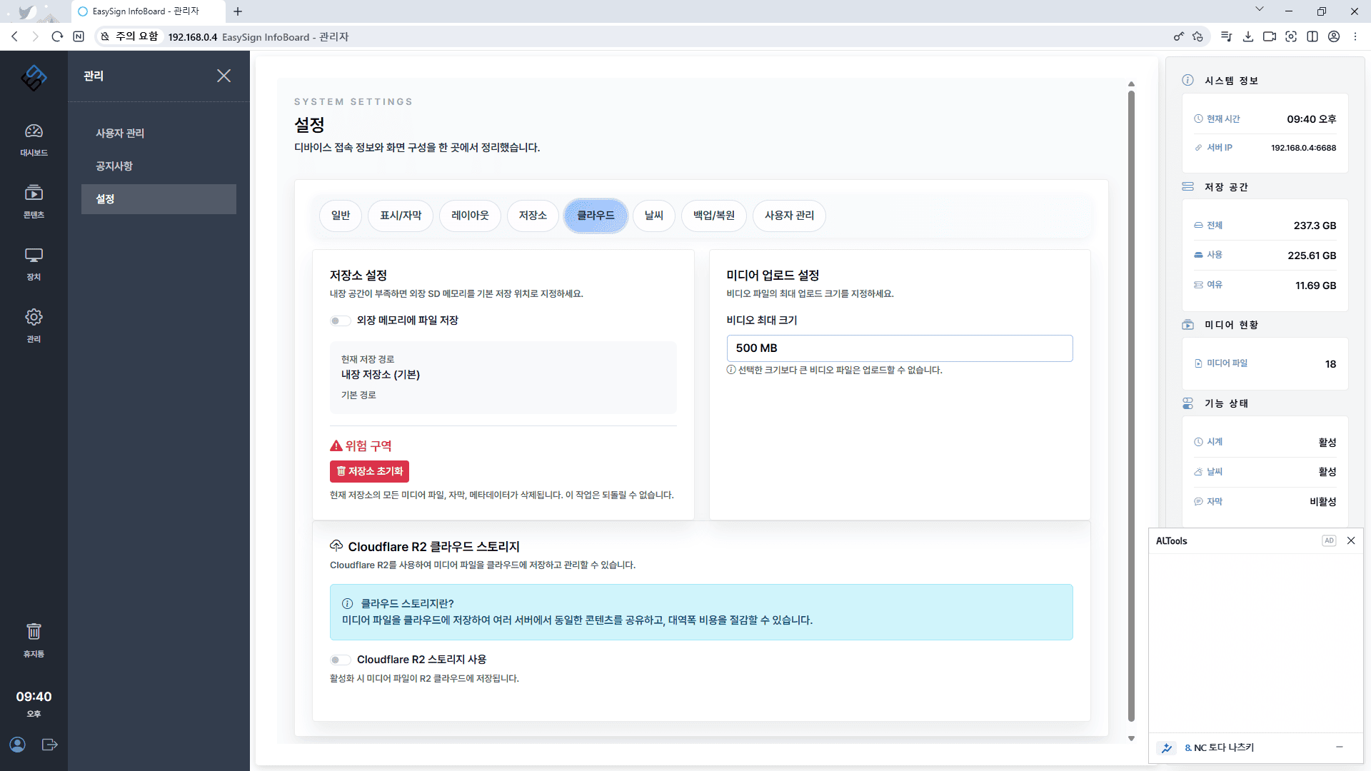 EasySign InfoBoard 솔루션은 Cloudflare R2는 S3 호환 오브젝트 스토리지를 이용하여, 대용량 미디어 파일을 저장하고 전국 단위 배포 시 안정적인 콘텐츠 전송이 가능한 클라우스 솔루션을 제공합니다.