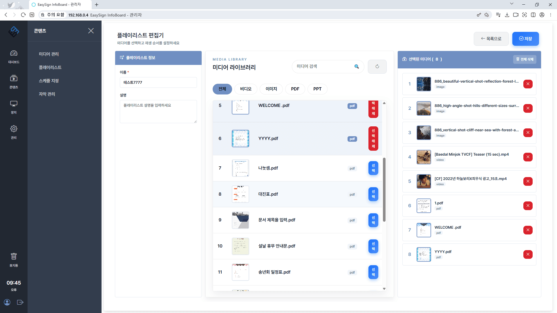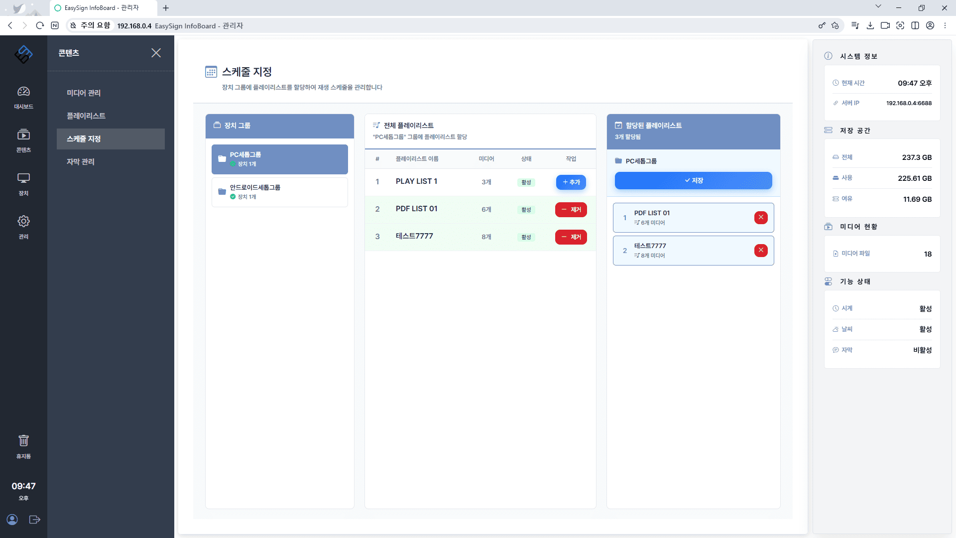 할당된 플레이리스트는 우측 패널에서 개별 삭제가 가능하며, 최종적으로 ‘저장’을 누르면 해당 그룹에 속한 모든 플레이어 장치가 지정된 플레이리스트의 미디어만 순서대로 재생합니다.