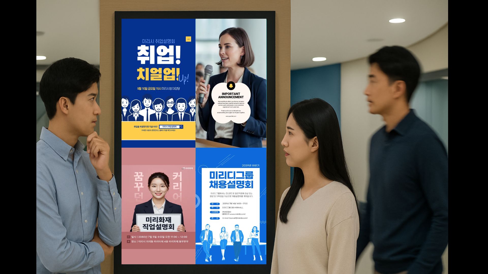브라우저만 있으면 누구나 쉽게 관리할 수 있으며, PDF · PPT · 이미지 · 동영상 등 여러 형식의 콘텐츠를 동시에 출력할 수 있어 현장의 안내 효율을 크게 높여줍니다.