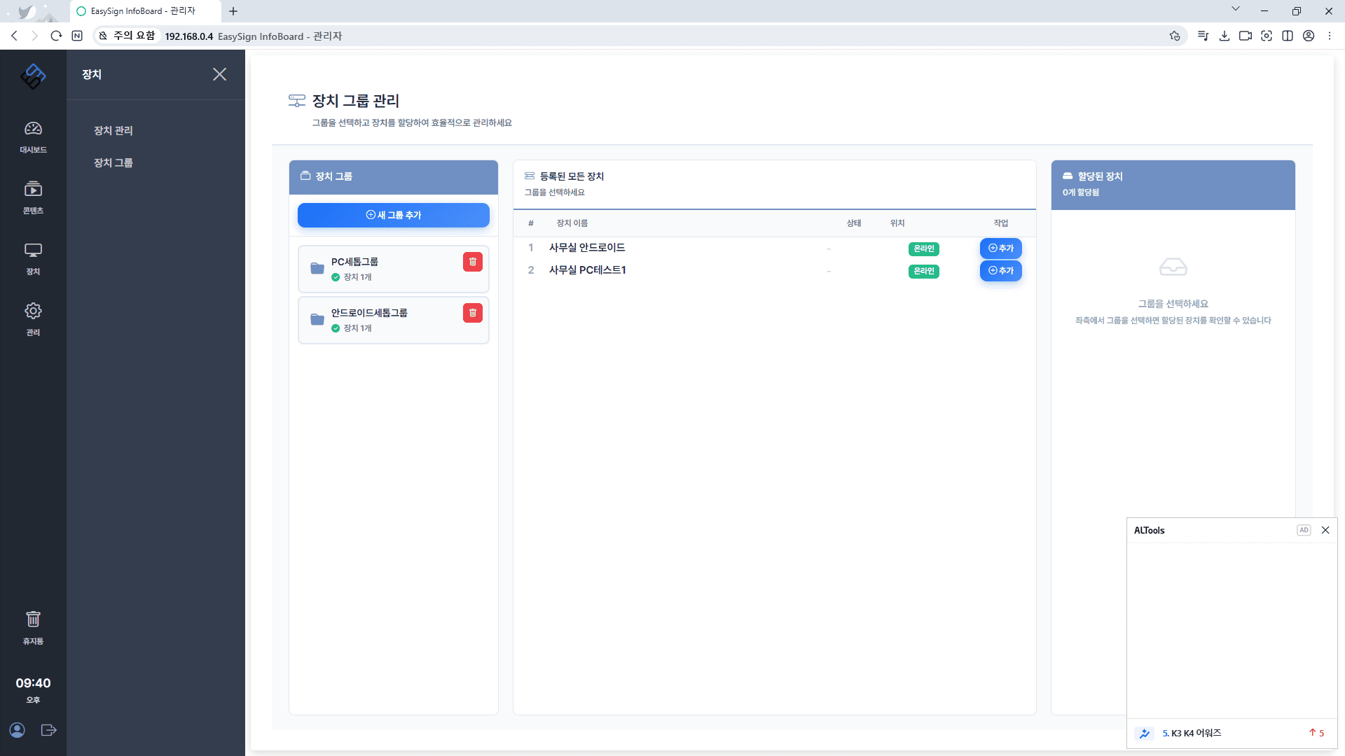필요한 장치를 선택해 ‘할당’ 버튼을 누르면 우측 패널에 해당 그룹에 속한 장치 목록이 나타나며, 개별 삭제가 가능하고 ‘장치 할당 저장’ 버튼으로 변경 사항을 확정합니다.