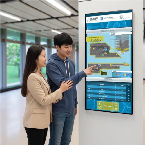 건물안내 사이니지 솔루션 / 층별안내 / 위치안내 Easy Guide 솔루션은 건물안내솔루션으로 엘리베이터 앞에 서 있는 사람 누구나 터치 몇 번으로 건물의 입주사를 빠를게 위치를 찾게 해 주는 건물안내솔루션 입니다. 화면을 터치하면 해당 층 도면이 넓게 펼쳐지고, ㄱ·ㄴ·ㄷ 초성 검색으로 매장이나 사무실을 금방 찾을 수 있으며, 결과를 누르면 지도 위에 마커가 즉시 떠서 정확한 위치까지 안내합니다. 사용자가 사용 후 자리를 뜨면 광고/ 안내 이미지와 날씨 정보가 화면이 자동 재생돼 로비 홍보판으로 변신하고, 관리자는 웹 브라우저에서 층 정보·테마·콘텐츠를 실시간으로 바꿔 언제나 최신 안내 정보를 유지할 수 있습니다. 또한 네트워크가 끊겨도 로컬에 저장된 데이터로 안내가 계속되기 때문에 안정적인 운영이 가능하여 방문 고객의 사용상의 불편이 최소화된 편리한 건물안내 솔루션입니다.